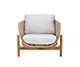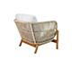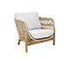 The Tribal Outdoor Chair features a light-colored rope frame and wood base. The cushions are a light colored linen blend.