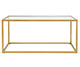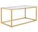 The Frame Coffee Table has a gold, metal frame and a glass top. It is also available in a slightly larger size in chrome.